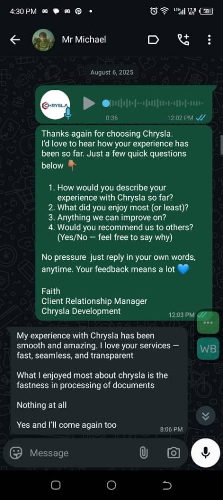 Receive your plot’s allocation and all documentation (Deed of Assignment, Registered Survey within 2 days of payment plus Lodgement Certificate from the Ministry of Lands and survey.